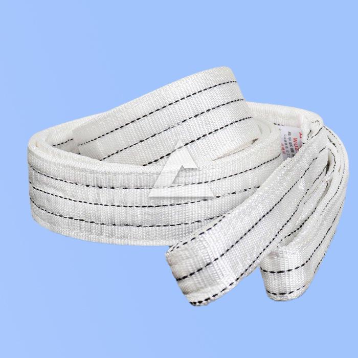 另外一种使用方法就是一条2米1吨白色丙纶吊装带直接结套横吊固定住油桶或者其他重物,然后作为吊点的一侧带身或环眼挂在货叉上。这种方式相当于代替了吊机起重吊钩也是符合使用规范的,但需注意的是不能通过叉车吊装带吊运太重的货物,因为货叉不如吊钩一样符合要求,容易对带皮造成磨损或破断。